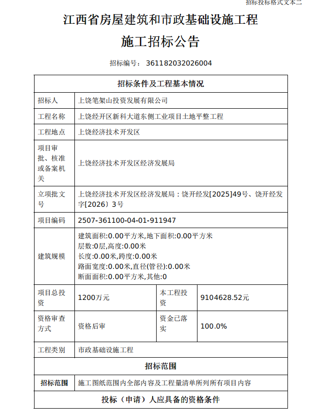 上饒經(jīng)開區(qū)新科大道東側(cè)工業(yè)項目土地平整工程施工招標公告